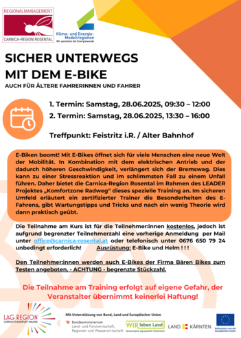 E-Biken boomt! Mit E-Bikes öffnet sich für viele Menschen eine neue Welt der Mobilität. In Kombination mit dem elektrischen Antrieb und der dadurch höheren Geschwindigkeit, verlängert sich der Bremsweg. Dies kann zu einer Stressreaktion und im schlimmsten Fall zu einem Unfall führen. Daher bietet die Carnica-Region Rosental im Rahmen des LEADER Projektes „Komfortzone Radweg“ dieses spezielle Training an. Im sicheren Umfeld erläutert ein zertifizierter Trainer die Besonderheiten des E-Fahrens, gibt Wartungstipps und Tricks und nach ein wenig Theorie wird dann praktisch geübt.