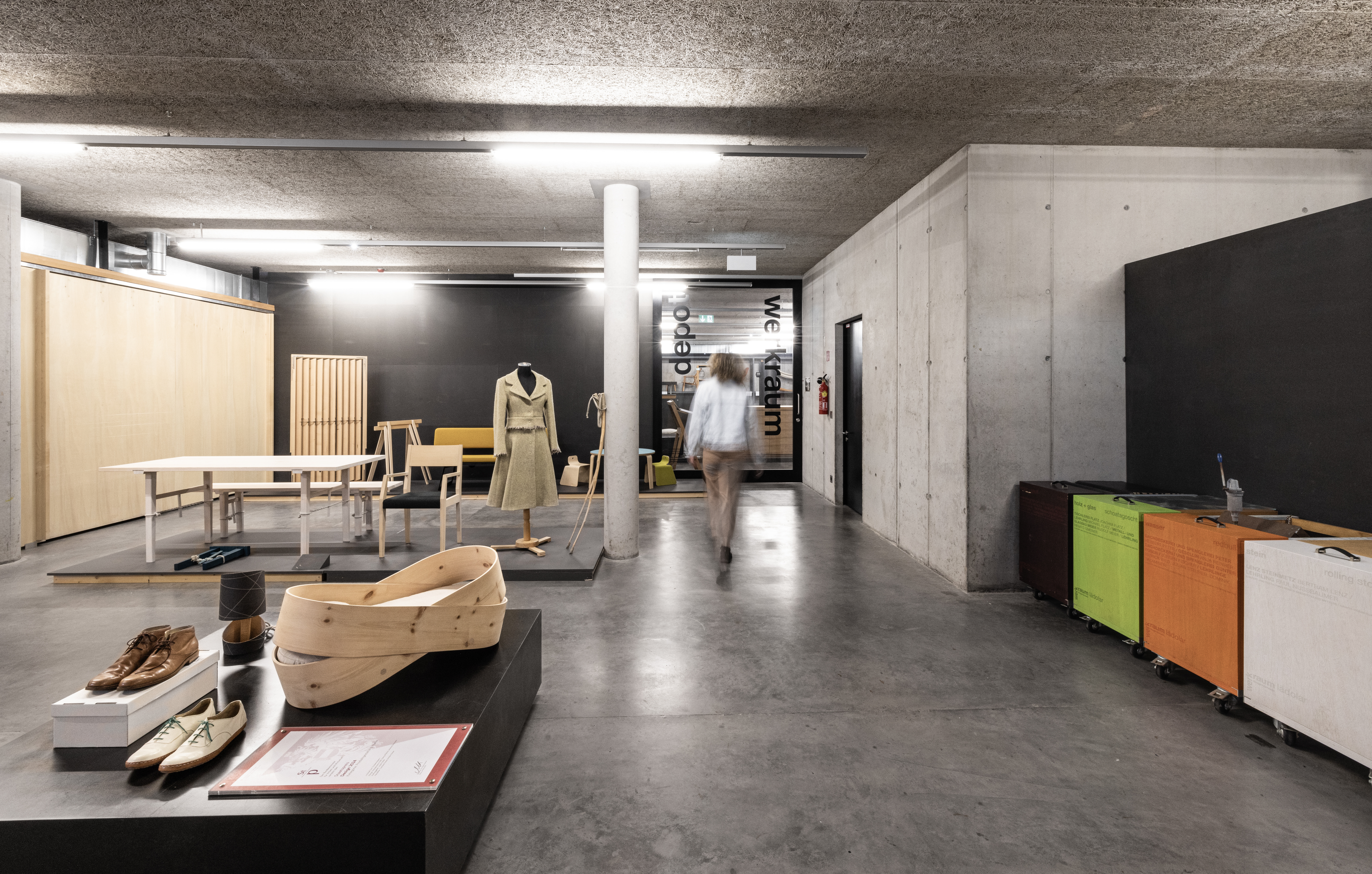 Das Werkraum Depot im Untergeschoss gibt mit seinen über 100 Exponaten Einblicke in das Werken und Wirken der regionalen Handwerksbetriebe. Die Werkstücke stammen sowohl aus der Sammlung des Vorarlberg Museums als auch aus Leihgaben direkt von den Mitgliedsbetrieben des Werkraum Bregenzerwald.