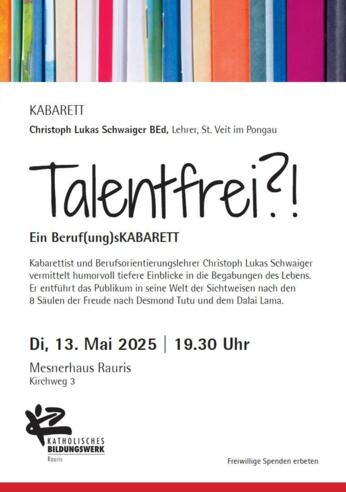 Kabarettist und Berufsorientierungsleherer Christophf Lukas Schwaiger vermittelt humorvoll tiefere Einblicke in die Begabungen des Lebens. Er entführt das Publikum in seine Welt der Sichtweisen nach den 8 Säulen der Freude nach Desmond Tutu und dem Dalai Lama.