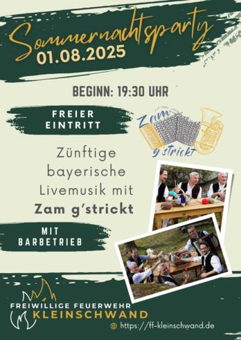 SommernachtspartyAm 01.08.2025 ab 19:30 Uhr findet die Sommernachtsparty der Freiwilligen Feuerwehr Kleinschwand statt. Für Stimmung sorgen die Musiker von Zam g’strickt mit zünftiger bayerischer Musik. Für das leibliche Wohl ist bestens gesorgt und für einen kleinen Absacker steht eine Bar bereit.