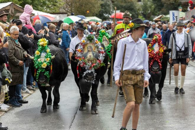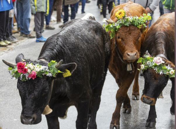 bei dem prächtig geschmückte Kühe von der Alm ins Tal zurückkehren.