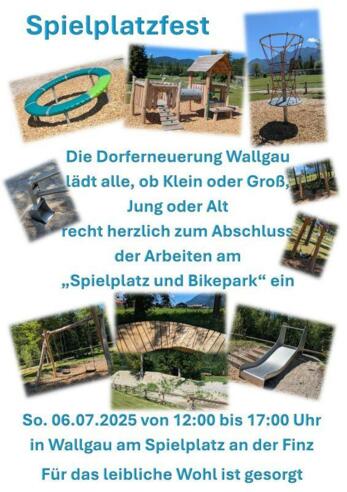 lädt die Dorferneuerung Wallgau zum Abschluss der Arbeiten am Spielplatz und Bikepark an der Finz zum Spielplatzfest ein.Von 13.00 bis 16.30 Uhr KinderschminkenEinheimische und Gäste sind herzlich willkommen.