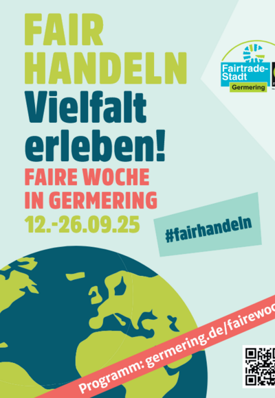 Vernissage zur Kunstausstellung der Malschule Germering zur Fairen Woche 2025"UNSERE ERDE – SIE HAT FAIR TRADE UND MENSCHLICHKEIT VERDIENT!"Die Malschule Germering lädt zur Vernissage ins Rathaus ein und präsentiert die bunten Erdkugeln, die im Ferienprogramm von den Kindern gestaltet wurden.Jede einzelne Erdkugel symbolisiert den Wunsch nach Fairness, nachhaltigem Handel und einem harmonischen Miteinander auf unserem Planeten. Die Kunstwerke zeigen, wie wichtig es ist, gemeinsam für eine gerechte und umweltfreundliche Zukunft einzustehen.Mehr Informationen zur Fairen Woche 2025:www.germering.de/fairewocheEintritt frei!Veranstalterin: Malschule Germering
