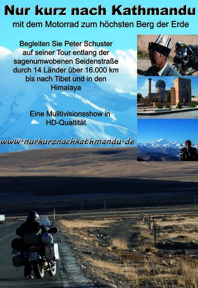 Peter Schuster aus Schernfeld bei Eichstätt und sein Freund Peppi Adametz machten sich mit ihren Motorrädern auf eine Abenteuerreise durch 14 Länder über 16.000 km, die sie vor die unterschiedlichsten Herausforderungen stellte: nicht enden wollende Offroadfahrten auf den Schotter- und Sandpisten Usbekistans und Kirgistans, extreme Temperaturunterschiede von fast 60° C, unvorstellbare Verhältnisse am Shariston-Pass und im mörderischen Anzob-Tunnel, eine nicht für möglich gehaltene Pechsträhne mit Schäden an den Motorrädern in Kirgistan, das Überqueren der höchsten Pässe der Erde im Himalaya und der halsbrecherische Straßenverkehr in Kathmandu.