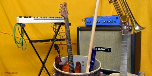 Schlagzeug, Bass, E-Gitarre, Westerngitarre, Piano und Mics sowie elektronisches Retrospielzeug stehen bei der Veranstaltung bereit, sind spielfertig und wollen verwendet werden!