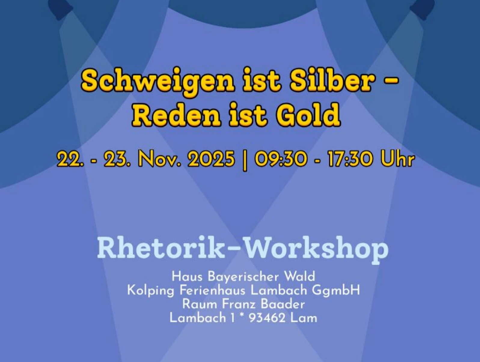 Rhetorik-WorkshopTrainieren Sie Selbstsicherheit, Reden vor Gruppen und Schlagfertigkeit in einem geschützten Rahmen und entspannter Atmosphäre!Termin: 22.11 - 23.11 2025 von 09:30-17:30 UhrTN-Gebühr 210 € inkl. ausführlichem Skript (zuzügl. frei wählbarer Tagungspauschale an das Kolping Ferienhaus Lambach gGmbH) Anmeldung und Seminarexposee unter Tel.: 0170-5803701 (Frau Mohrmann)Veranstaltungsort:Haus Bayerischer WaldLambach 193462 LamKursraum: Franz Baader