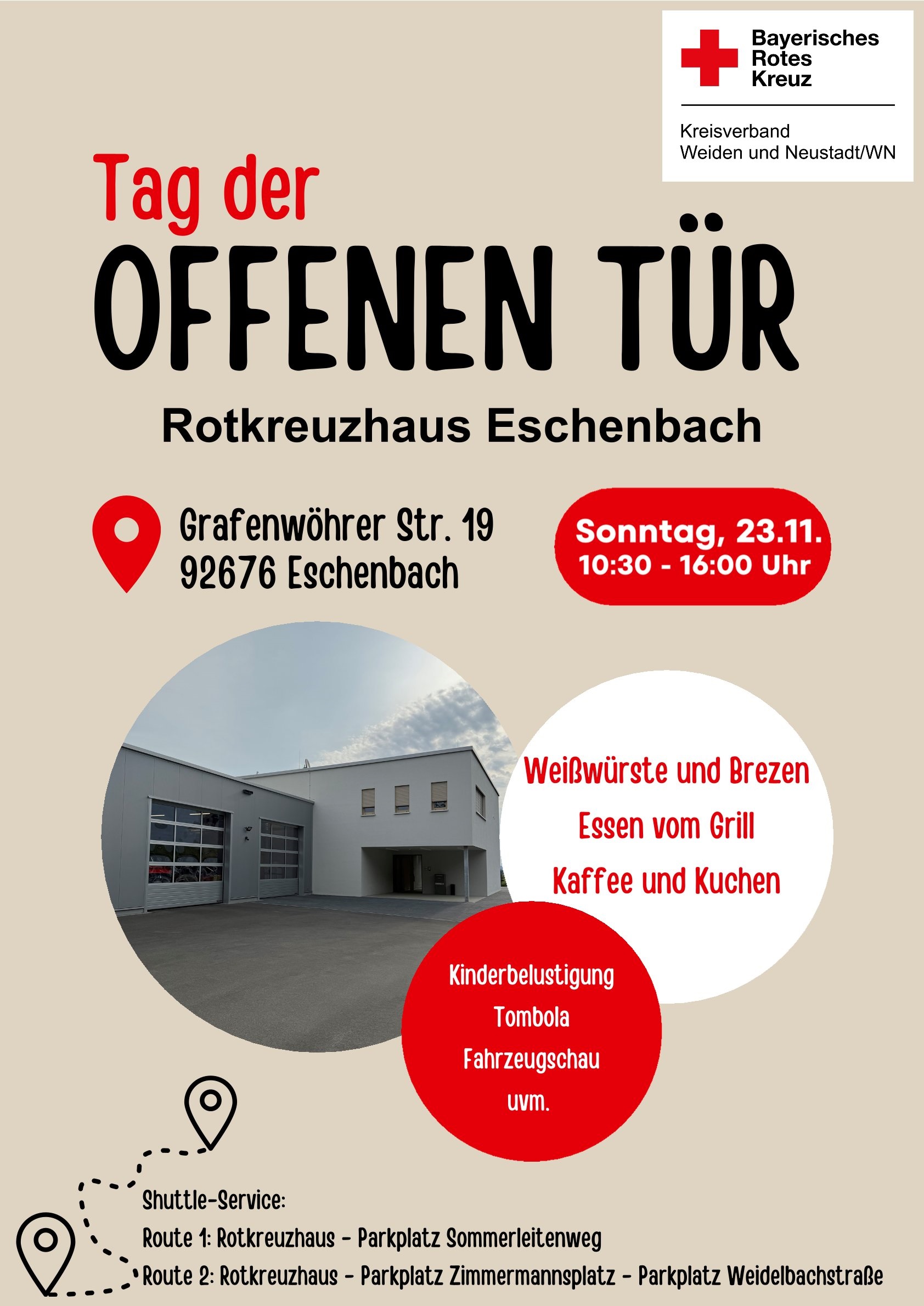 Tag der offenen Tür am Rotkreuzhaus Eschenbach am Sonntag, 23.11.25 von 10:30 - 16:00 Uhr.Weißwürste und Brezen, Essen vom Grill, Kaffee und KuchenKinderbelustigung, Tombola, Fahrzeugschau uvm.Es gibt einen Shuttle-Service