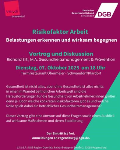 Belastungen am Arbeitsplatz nehmen zu und die Gefahren für die psychische Gesundheit steigen.Wir der ver.di Ortsverein Schwandorf und der DGB Kreisverband Schwandorf wollen uns mit dem Thema genauer befassen und laden daher alle Interessierten ein zum Vortrag mit Diskussion mit Experten Richard Ertl (M.A. Gesundheitsmanagement und Prävention) am Dienstag, 7. Oktober 2025 um 18 Uhr im Turmrestaurant Obermeier in Klardorf.Risikofaktor ArbeitBelastungen erkennen und wirksam begegnenGesundheit ist nicht alles, aber ohne Gesundheit ist alles nichts: in einer im Wandel befindlichen Arbeitswelt sind die Herausforderungen für die Gesundheit von Arbeitnehmer:innen größer denn je.Doch welche konkreten Risikofaktoren gibt es und welche Rolle spielt dabei ein betriebliches Gesundheitsmanagement?Dieser Vortrag gibt eine Antwort auf diese Fragen sowie einen Ausblick auf wirksame Maßnahmen und deren Etablierung.