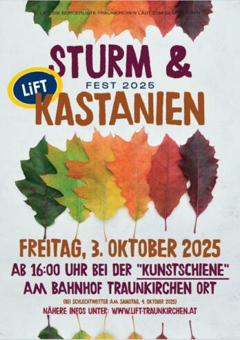 Die Bürgerliste Traunkirchen lädt zum Sturm & Kastanienfest ein. Heuer erstmals in der Kunstschiene, dem ehemaligen Warteraum am pittoresken Bahnhof Traunkirchen Ort. Am besten direkt mit dem Zug anreisen, da Parkplätze rar, und die Zufahrt abenteuerlich ist. Perfekt für Bewegungsfreudige ist die gemeinsame 20-Minuten-Wanderung vom Parkplatz Harrachberg zum Fest. Wir warten auf euch am Treffpunkt Parkplatz Harrachberg um 16 Uhr!