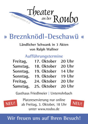 An den letzten beiden Oktober-Wochenenden finden wieder die Theateraufführungen des Theaters an der Roubo im Gasthaus Friedlmeier in Unterrohrbach statt.