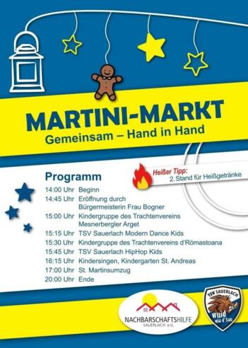 Martini Markt der Nachbarschaftshilfe Sauerlach und des TSV Sauerlach, Abt. Handball - Gemeinsam Hand in Hand für den guten Zweck mit Laternenumzug ab 17 Uhr.Programm: