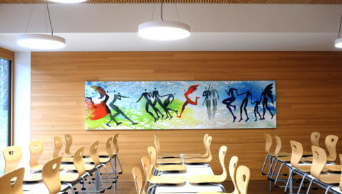 - Weltennetz im Verbindungsgang, in den Mensaräumen die drei Bilder Feuerengel-Inbild, Tierfries,