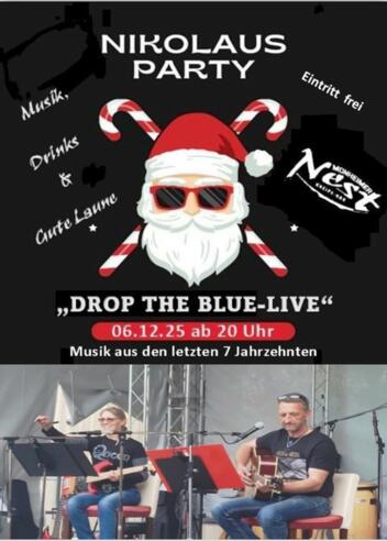 Einladung zu unserer Nikolaus-Party im Monheimer Nest mit der Band "DROP THE BLUE"Eine Akustik Cover Band mit Liedern aus den letzten 7 Jahrzehnten ist LIVE bei uns im Monheimer Nest zu Gast. Zwei Stimmen, die man einfach mal gehört haben muss. Kommt vorbei und genießt mit uns einen schönen Abend mit toller Musik. Wir freuen uns auf Euch