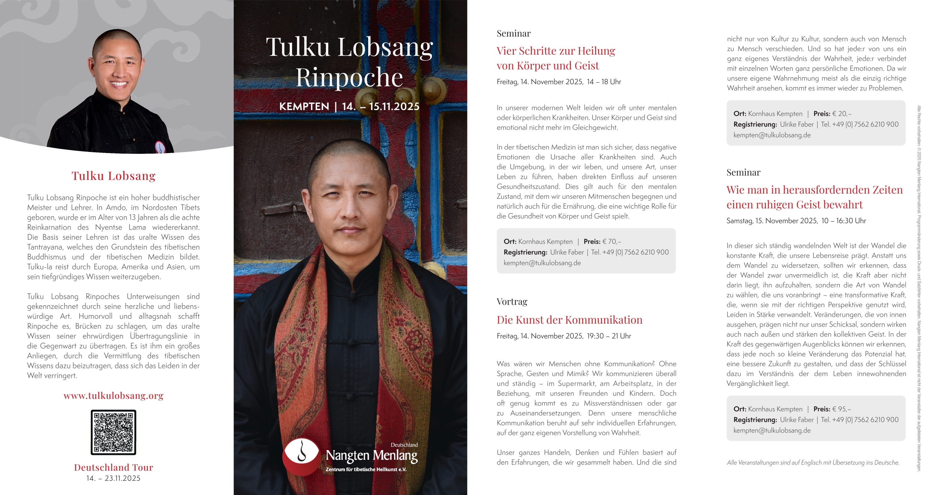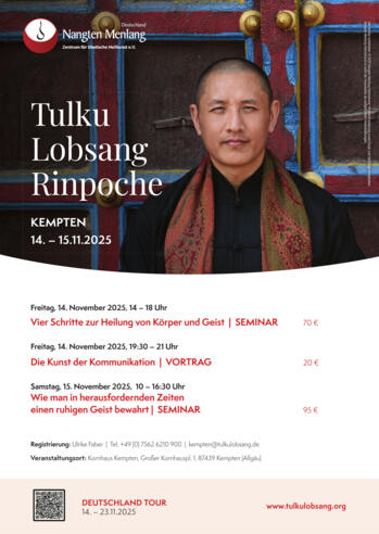 Tulku Lobsang Rinpoche zeigt uns vier Schritte, um Körper und Geist zu heilen und spricht über die grundlegenden Prinzipien, um im Gleichgewicht zu sein und uns von Problemen nicht aus der Bahn werfen zu lassen.