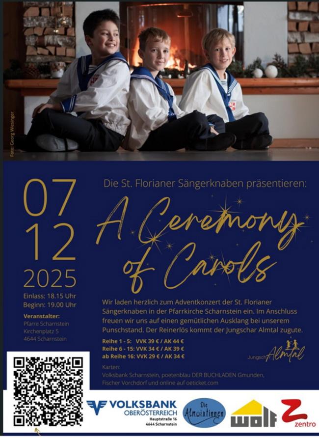 Wir laden herzlich zum Adventkonzert der St. Florianer Sängerknaben in der Pfarrkirche Scharnstein ein.