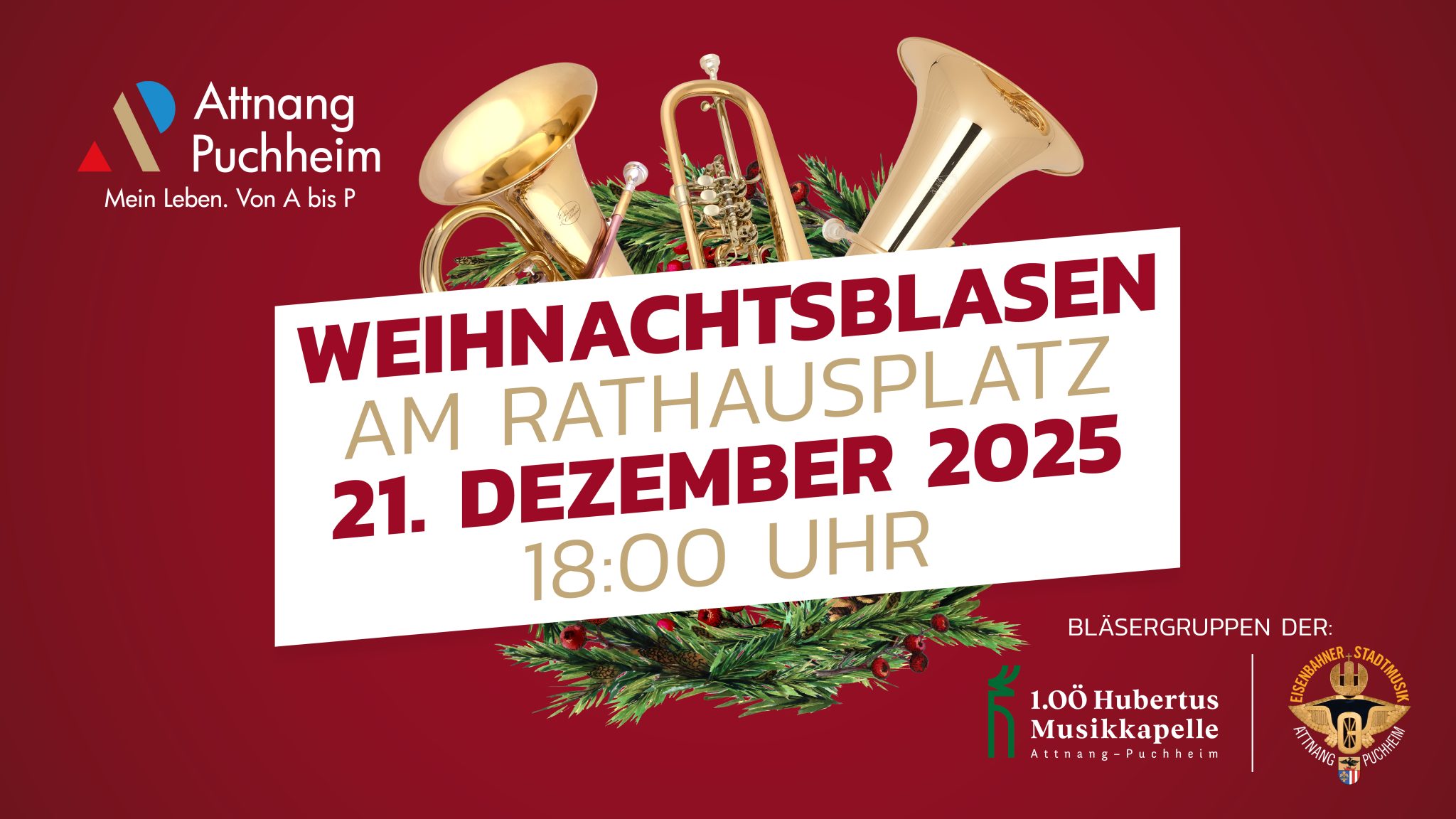 Gemeinsam gestalten die Eisenbahner Stadtmusik Attnang-Puchheim und die 1. OÖ Hubertusmusikkapelle einen musikalischen Adventabend, der zum Innehalten und Genießen einlädt.