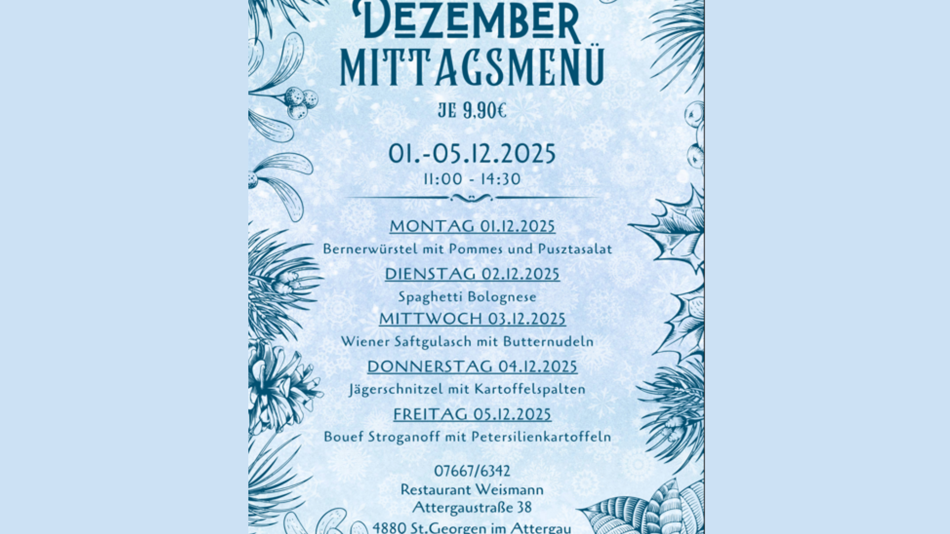 in der Woche vom 01. bis 05. Dezember 2025 gibt es ein täglich wechselndes Mittagsmenü zum Preis von 9,90 €.