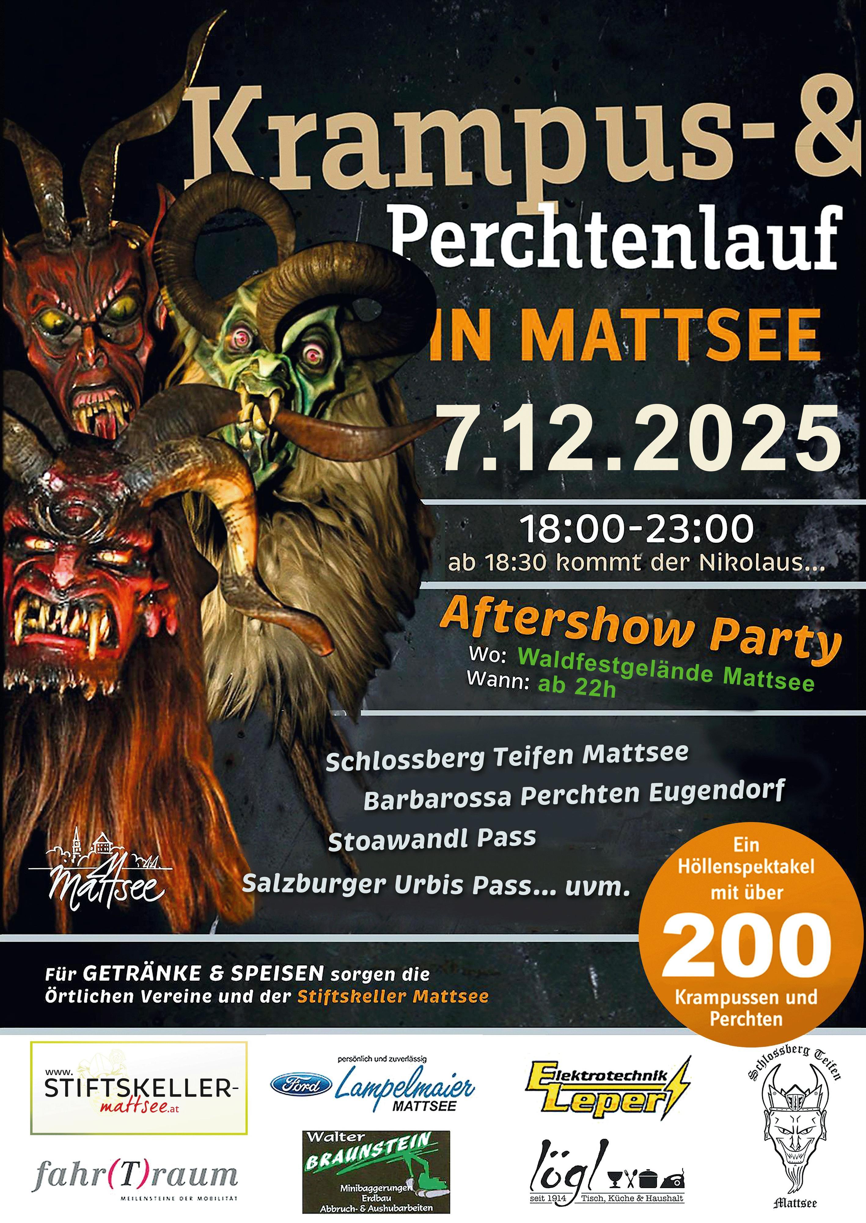 Krampuslauf der Schlossberg Teifen Mattsee am 07.12.2025 ab 18:00 Uhr. Die ersten paar Meter vor der Apotheke wird wieder ein Kinderbereich gemacht - der abgesperrt wird. Der Eintritt ist frei, und jeder ist herzlich willkommen!