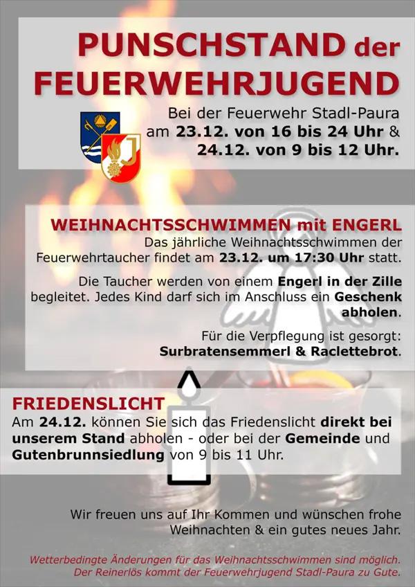 Das jährliche Weihnachtsschwimmen der Feuerwehrtaucher findet am 23.12. um 17:00 Uhr statt. Die Taucher werden von einem Engerl in der Zille begleitet. Jedes Kind darf sich im Anschluss ein Geschenk abholen.