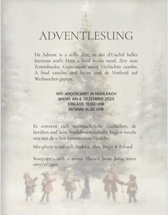 Reserviert euch einen Tisch und freut euch auf einen schönen Abend mit Adventlesung und netten Gesprächen.