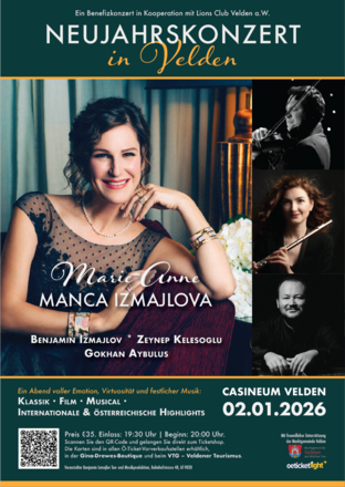 Wir laden Sie ein, gemeinsam mit uns das neue Jahr auf wunderbare Weise zu beginnen. Ein Besuch in Velden ist immer ein Erlebnis – verbinden Sie ihn mit einem Konzert in der renommierten Casineum Velden. Das Programm ist traditionell, gleichzeitig frisch interpretiert und inspirierend, mit Liedern und Instrumentalstücken, die Ihr Herz erwärmen, Ihre Seele berühren, Gänsehaut erzeugen und Ihre innere Energie mit reiner Freude aufladen. Das Konzert wird von herausragenden Musikern dargeboten, jeder ein angesehener europäischer Solist.