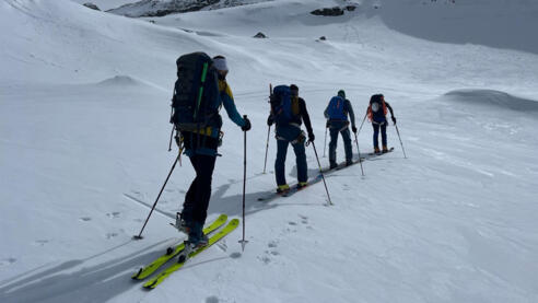 Ski touring equipment, crampons, emergency equipment (avalanche transceiver, shovel, probe), rucksack with snack and thermos flask with tea
