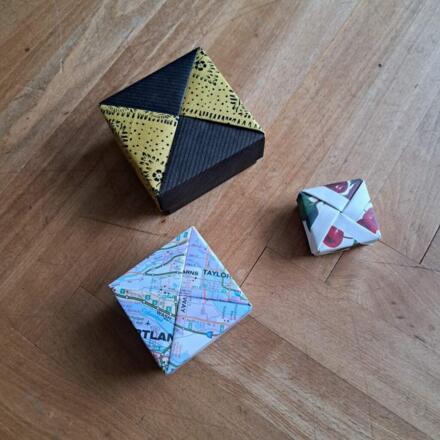 Wie man das ganz einfach auch zu Hause machen kann, zeigt Monika Winkelbauer in ihrem aktuellen Workshop. Gemeinsam fertigen die Teilnehmer*innen vor allem nützliche Behältnisse (Geschenkschachteln) in verschiedenen Größen und Ausführungen in Origamitechnik.