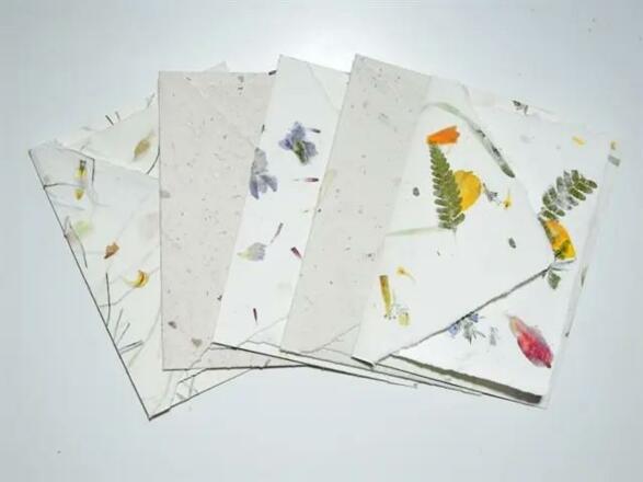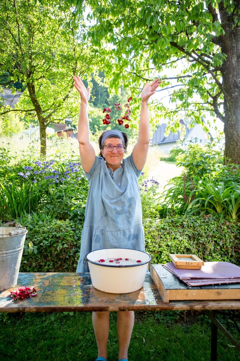 Sie schöpfen die Büttenpapiere für das Briefpapier. Es werden verschiedene Materialien und Bilder in das Papier eingearbeitet.