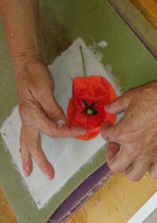Es werden verschiedene Sommerblüten und Blätter in das Papier eingefügt.