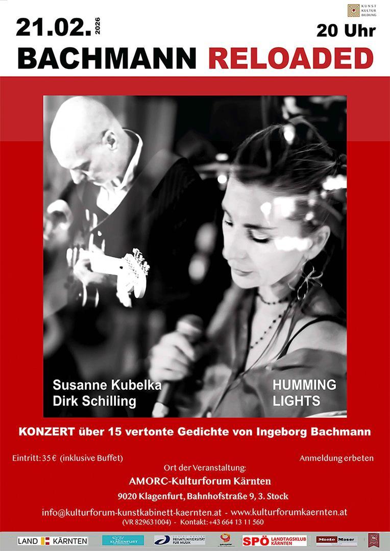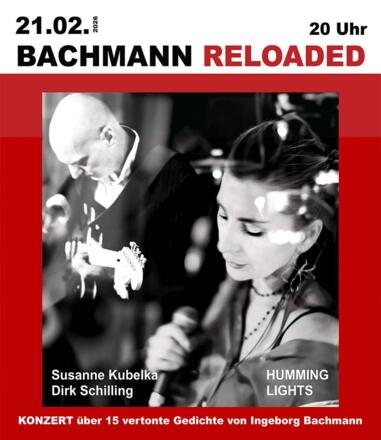 Ein Abend zwischen Chanson und Avantgarde, jedes Gedicht ein eigener musikalischer Ort . Susanne Kubelka und Dirk Schilling verdichten Gedichte Ingeborg Bachmanns in Liedern zu einem Abend mit Gesang, E- Gitarre, Keyboard, Bass und Trommeln.