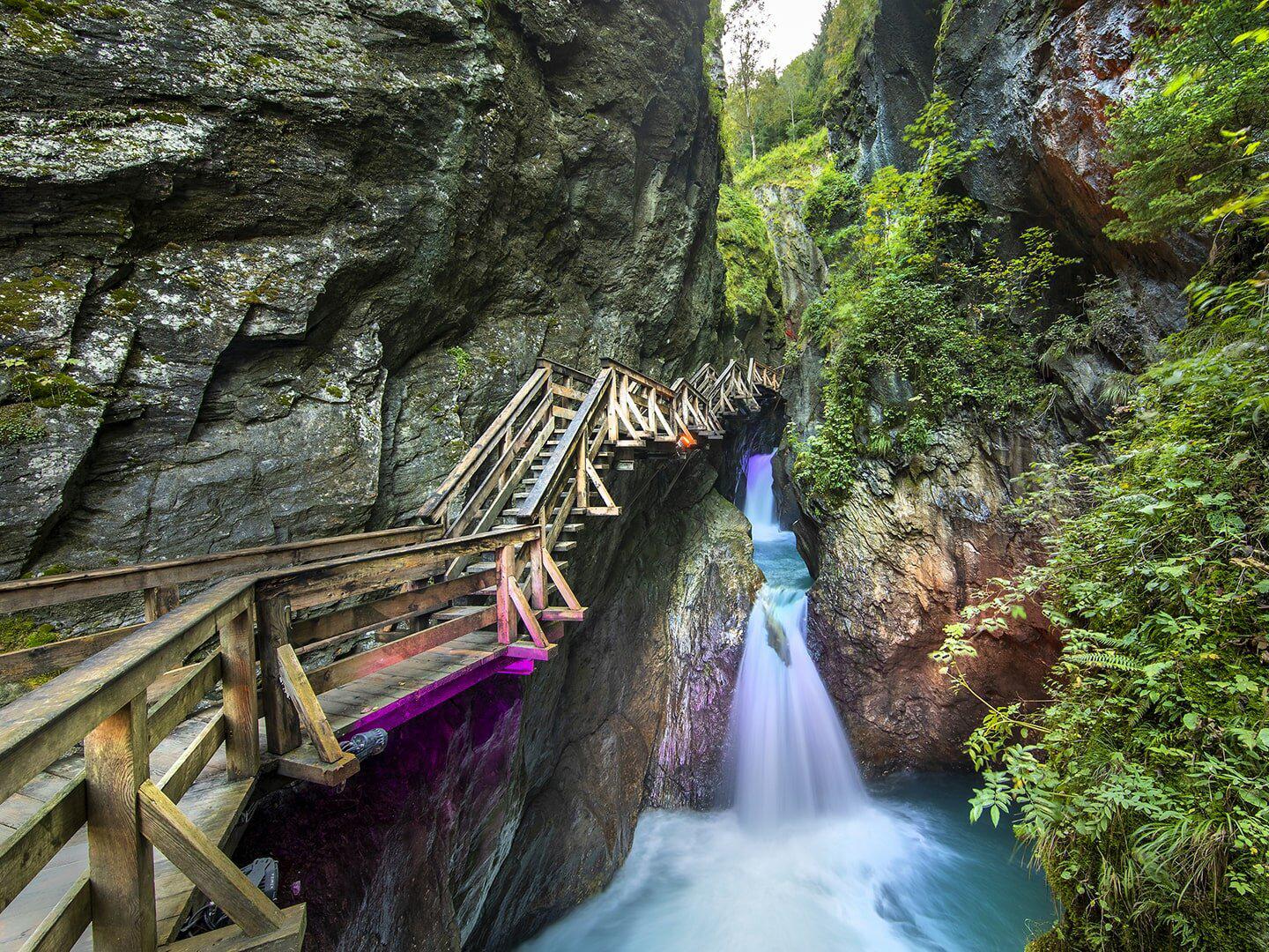 Während des Spaziergangs durch die Schlucht treffen tosende Wassermassen auf schroffe Felsformationen, die im Zusammenspiel mit Licht und Schatten besonders eindrucksvoll wirken. Die natürliche Kraft des Wassers und die besondere Inszenierung machen den Weg durch die Klamm zu einem stillen, fast märchenhaften Erlebnis.