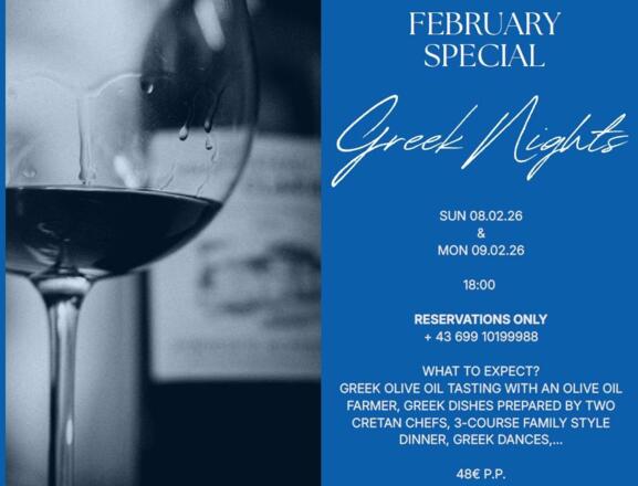 Freuen Sie sich auf eine Olivenöl-Verkostung mit einem griechischen Olivenölbauern, authentische griechische Küche, liebevoll zubereitet von zwei Köchinnen aus Kreta, sowie ein 3-gängiges Dinner im Family-Style.