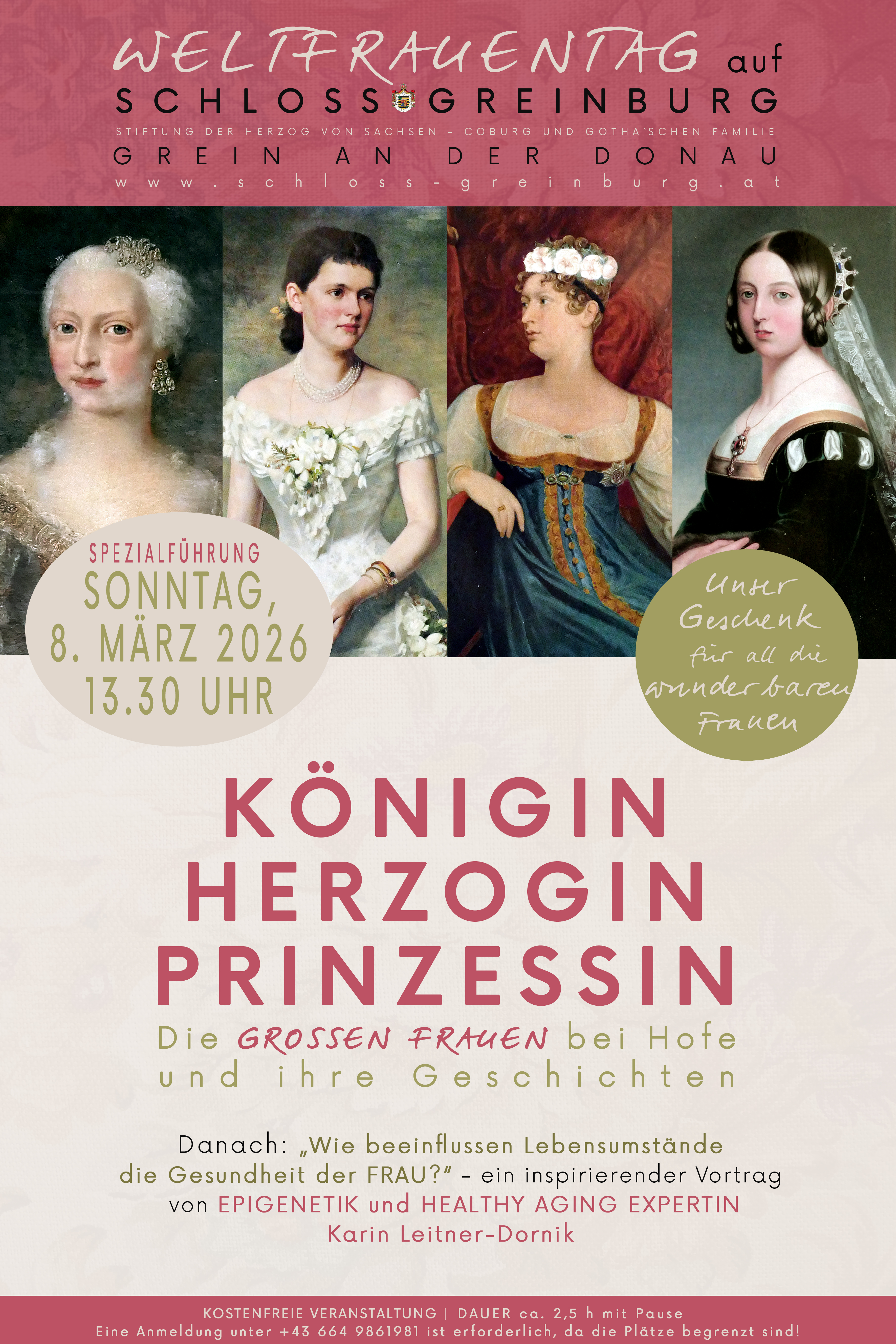 Den Auftakt macht die Spezialführung „KÖNIGIN, HERZOGIN, PRINZESSIN – die großen Frauen bei Hofe und ihre Geschichten“. Vier Frauen zwischen Erwartungen, Anpassung, Verantwortung und innerer Stärke erzählen von ihrem Leben. Wer genau hinhört, wird schnell feststellen: Viele der Themen, die diese Frauen geprägt haben, sind uns auch heute noch vertraut.
