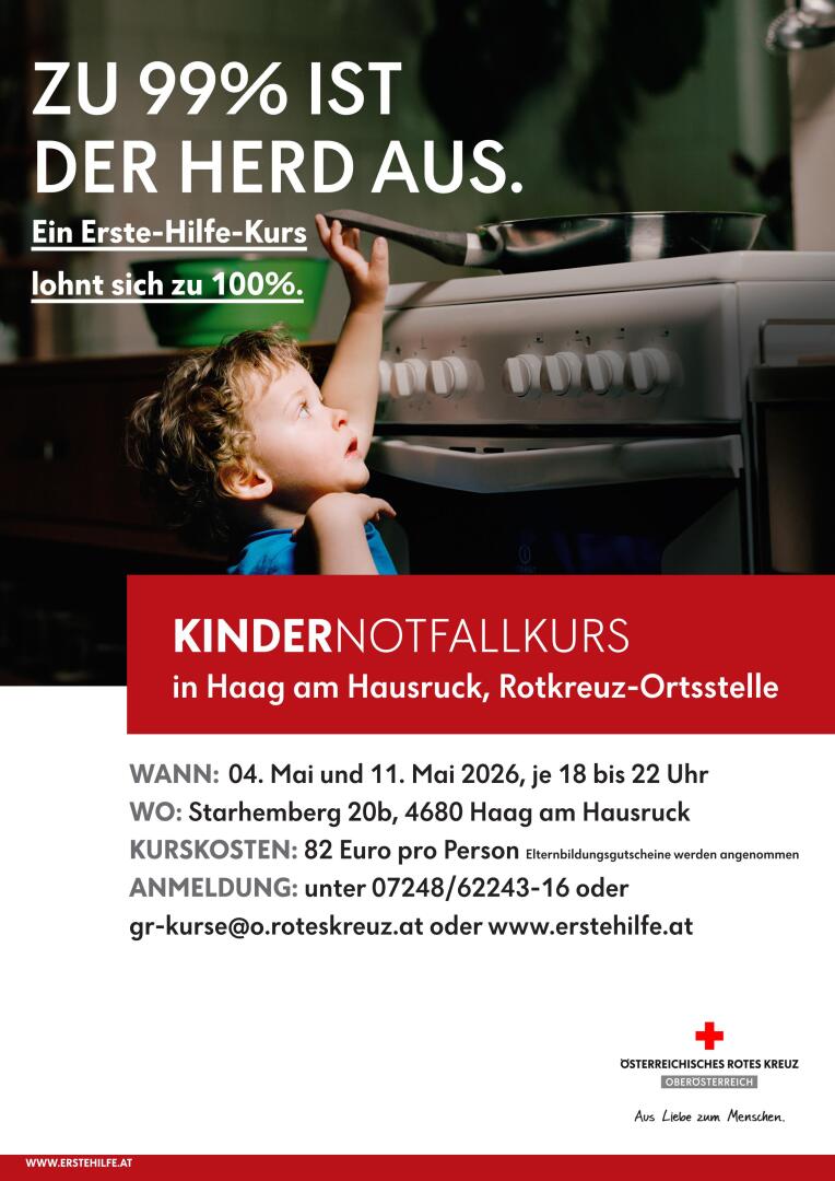 Der erste Kursteil findet am Montag, 4. Mai von 18 bis 22 Uhr statt, der zweite eine Woche später am 11. Mai, ebenso von 18 bis 22 Uhr. Der Kursbesuch kostet 82 Euro, Elternbildungsgutscheine werden angenommen. Anmeldungen unter 07248/62243-16 oder gr-kurse@o.roteskreuz.at