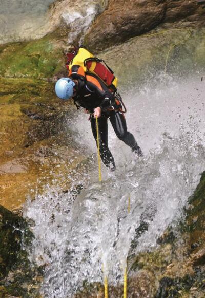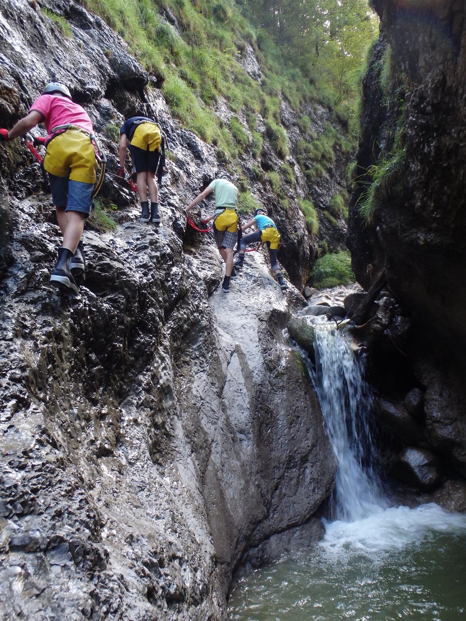 Wir steigen entlang eines Wildbaches durch eine enge Schlucht aufwärts. Seilbrücken, 2 Seilrutschen und lustige Klettersteigpassagen (max. 1-4 m über Grund) bringen uns auf trockenem Fuß durch diesen versteckten Canyon.