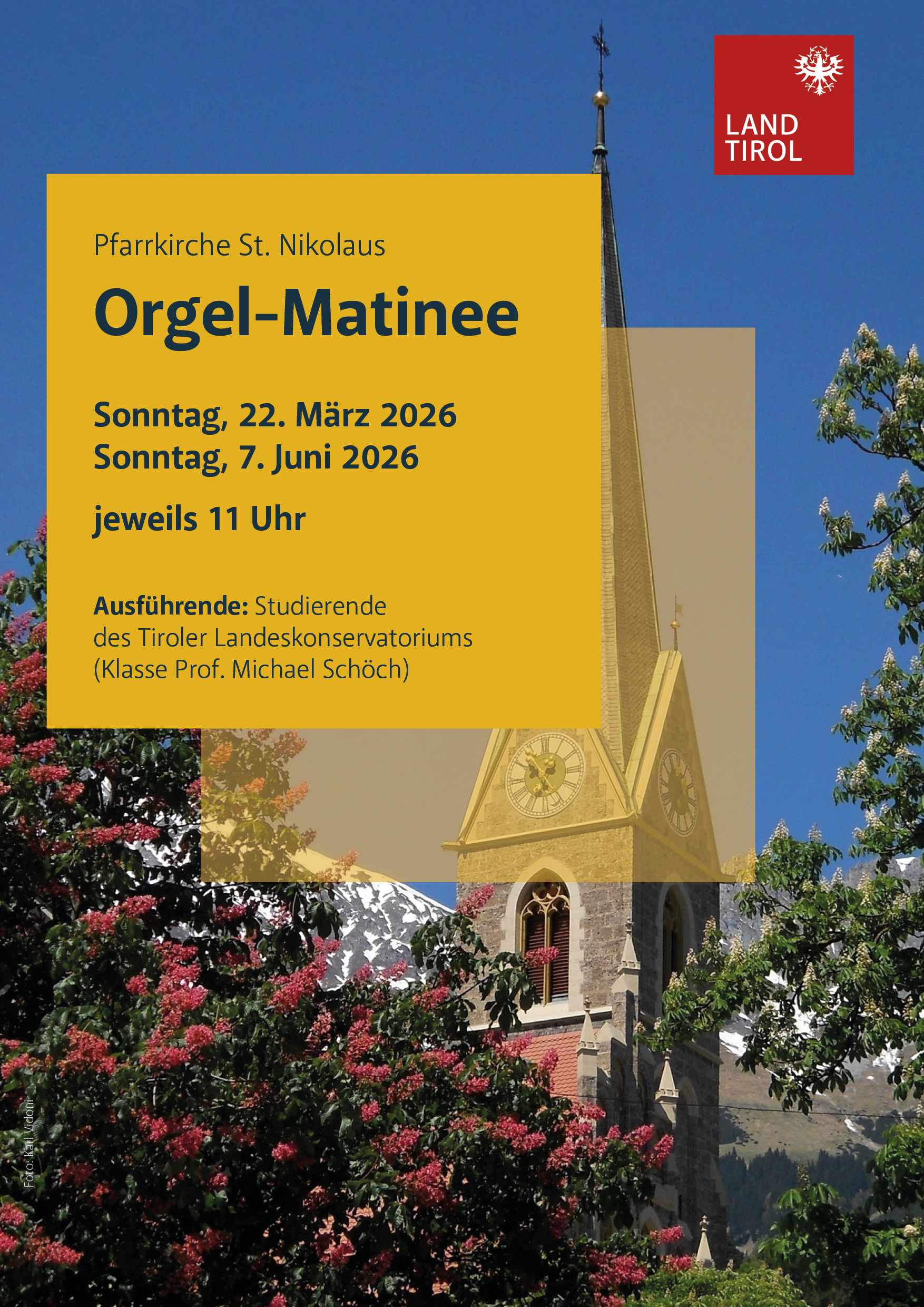 ORGELMATINÉE - eine Stunde lang am Sonntag um 11 Uhr. Im wunderbaren neugotischen Raum der Pfarrkirche St. Nikolaus in Innsbruck Orgelmusik genießen. Es spielen Studierende des Tiroler Landeskonservatoriums und des Mozarteums Innsbruck (Klasse Prof. Michael Schöch).