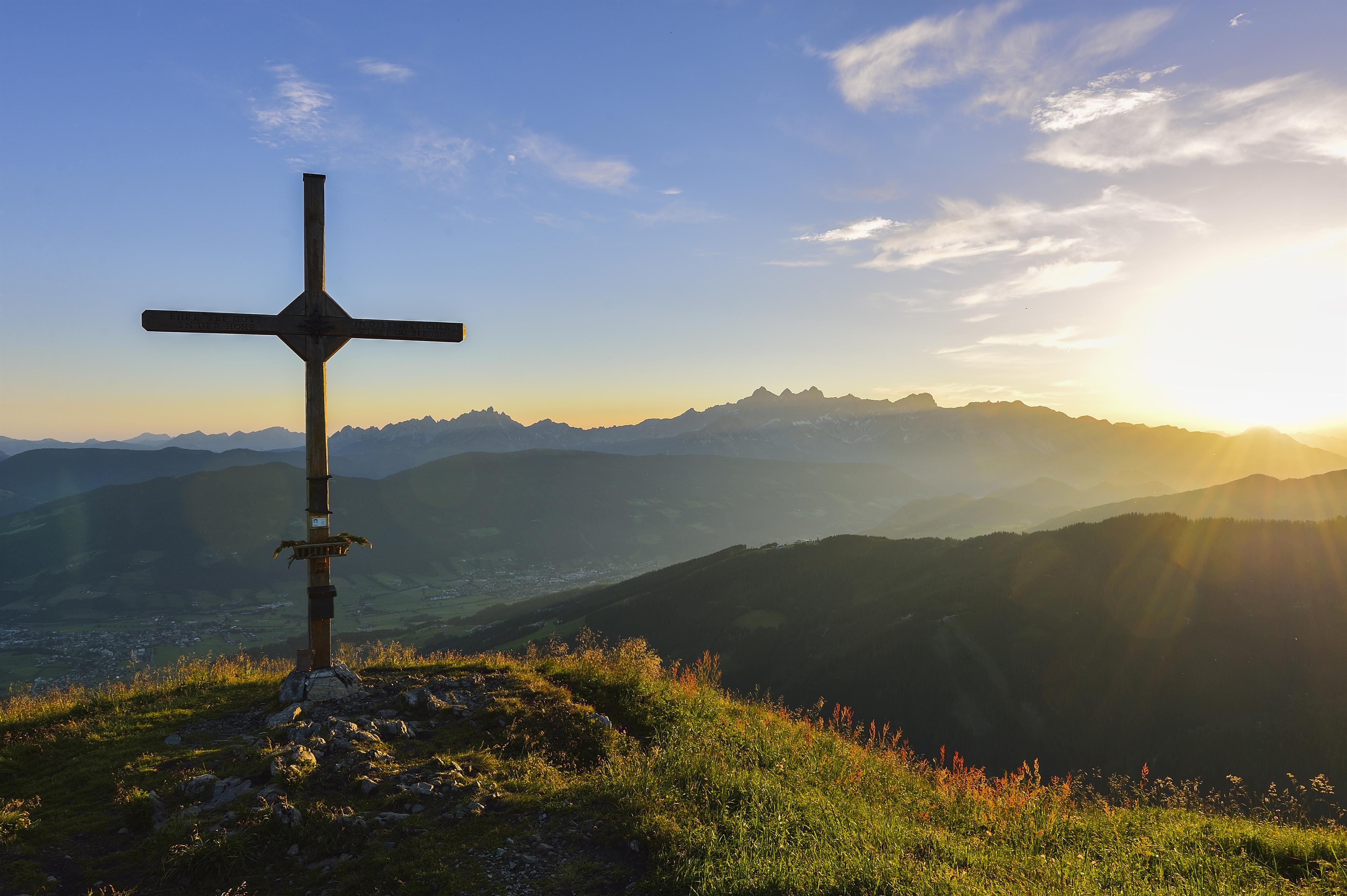 Am Gipfel eröffnet sich ein wunderschöner Rundblick auf die umliegende Bergwelt – vom Hohen Dachstein über die Bischofsmütze und den Hochkönig bis hin zum Tennen Gebirge und den Hohen Tauern mit dem Großglockner.