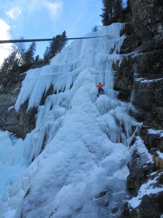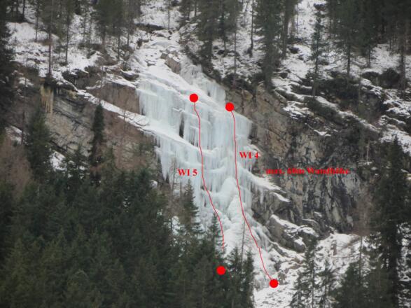 Der Eisfall kann auf unterschiedlichen Linien geklettert werden. Im Topo werden zwei logische Linien dargestellt, eine steilere linke Variante und eine etwas flachere rechte Variante. Beide Linien sind lohnend und führen über abwechslungsreiches Gelände mit unterschiedlichen Neigungen und Eisstrukturen. Ganz links gibt es senkrechte Säulenkletterei auf ca. 20m, allerdings ist dieser Bereich oft nicht besonders stabil aufgeeist und somit nicht immer kletterbar.