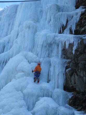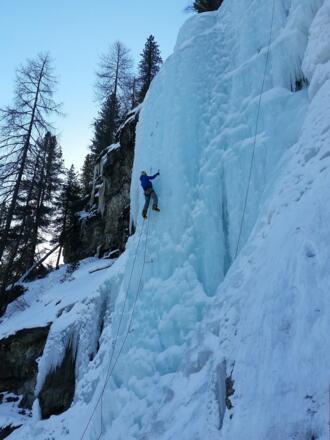 Toller, steiler Eisfall hoch über dem Pitztal. Mit einer Höhe von ca. 60m und einer Breite von ca. 30m sehr gut zum Topropen und für Vorstiegstraining geeignet.