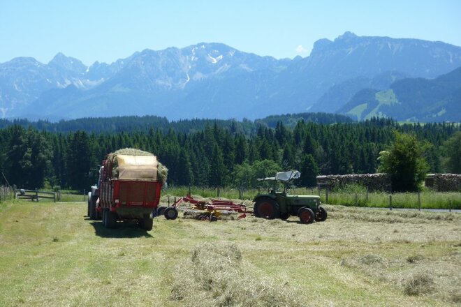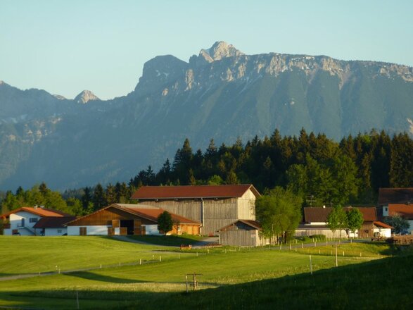 Ein erholsamer ruhiger Urlaub inmitten grüner Voralpenwiesen? Und noch dazu einen fantastischen Panaromablick auf die Allgäuer- und Tiroler Berge? Sie möchten hautnah das Bauernhofleben kennen- lernen? Dann sind Sie und Ihre Kinder bei uns genau richtig. Unser Bauernhof liegt am Ortsrand von Wildberg, abseits der Straße. In unserer komfortabel ausgestatteten vier Sterne Ferienwohnung Säulingblick werden Sie sich wohlfühlen. Unsere Ferienwohnung Alpspitzblick mit vier Schlafzimmer,ist besonders für große Familien oder Gruppen geeignet und in unserem Landhaus untergebracht. Für die kleinen Gäste stehen Dreiräder, Bobby-Car, verschiedene Traktors mit Anhänger, ein Kinderunimog, Ketcars für kleine und große Kinder, Spielhäuschen, großes Trampolin, Schaukel, Sandhaufen mit Wasser und eine Fußballwiese zur Verfügung. Besuchen Sie in bequemen Tagesausflügen die Königsschlösser, Oberstdorf oder das Tannheimertal in Österreich. Von flachen Wanderungen ab Hof, bis zu anspruchsvollen Bergtouren gibt es bei uns im Allgäu alles was das Herz begehrt. Freuen Sie sich!