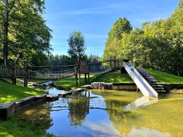 An der Wegkreuzung gehen wir links am Feldrand den gut ausgebauten Schotterweg Richtung Südosten entlang. Nach einem kurzen Waldstück queren wir die Straße und gehen ein kurzes Stück den Trimm-Dich-Pfad zwischen dem Waldbad und Parkplatz. Ein Abstecher zum Waldbad lohnt sich zu jeder Jahreszeit, sei es zum Baden, Einkehren, Verweilen oder zum Spielen auf dem großen Spielplatz.
