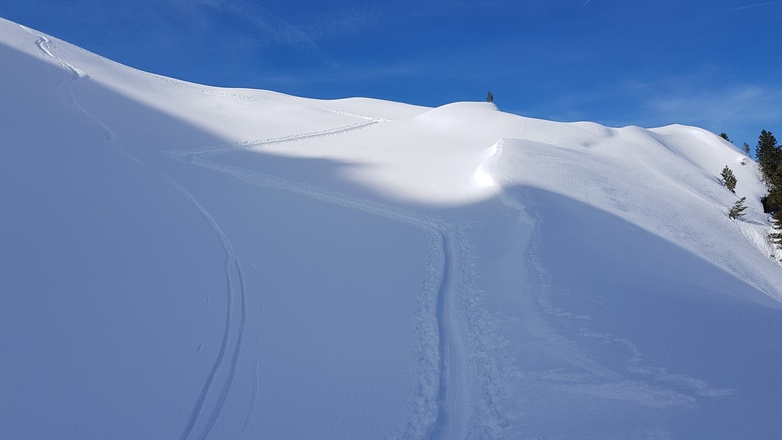 Abfahrt wie Aufstieg, wobei im unteren Teil im steilen Wald (wie im Track) abgefahren werden kann. Der Wald ist jedoch sehr steil (ca. 35° - 40°).