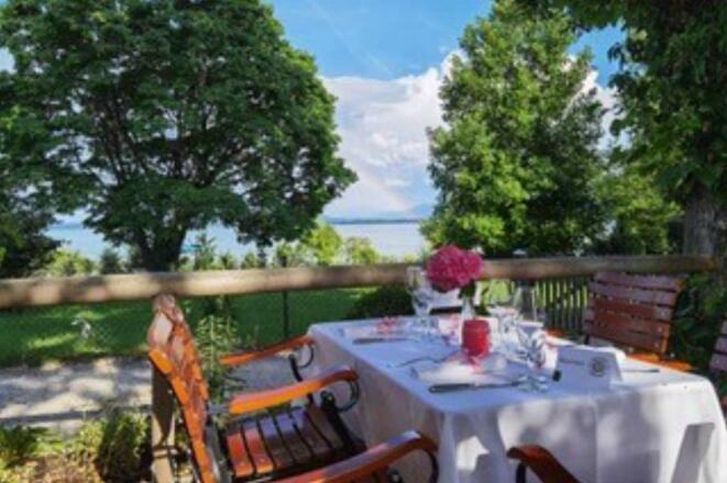 Vom höchsten Punkt der Fraueninsel grüßt diese Oase der gepflegten Gastlichkeit als eines der ältesten Wirtshäuser Bayerns.