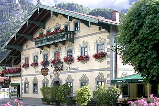 Der denkmalgeschützte Gasthof Falkenstein in Flintsbach mit seinem bekannten "Biergarten unter Kastanienbäumen" bietet feine bayerische Küche.