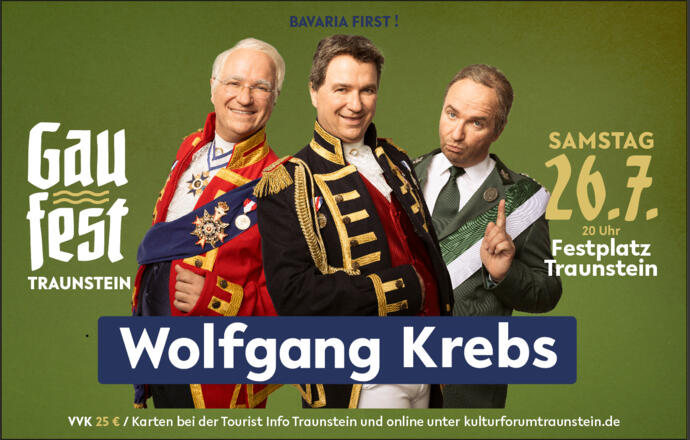 Am Samstag, den 26. Juli 2025, wird’s im Festzelt am Traunsteiner Festplatz richtig lustig: Wolfgang Krebs begeistert ab 20:00 Uhr mit seinem brandneuen Kabarett-Programm „BAVARIA FIRST!“. Bereits ab 18:00 Uhr ist Einlass, und in dieser Zeit sorgt die Musikgruppe BuntBlechBömisch für eine stimmungsvolle Einstimmung auf den Abend.