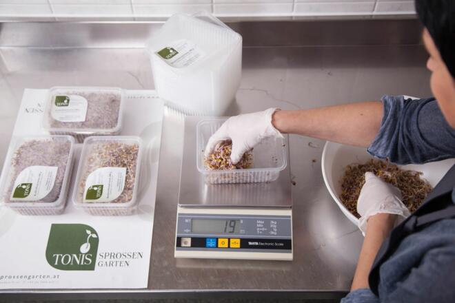 Durch die Beigabe von hochwertigem, erstklassigem Quellwasser entwickelt sich der Samen zu einer wohlschmeckenden, vitaminreichen Jungpflanze. Sprossen von verschiedenen Gemüsesamen und Hülsenfrüchten werden in Tonis Sprossengarten in Landeck produziert.