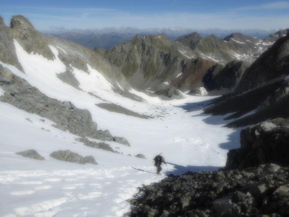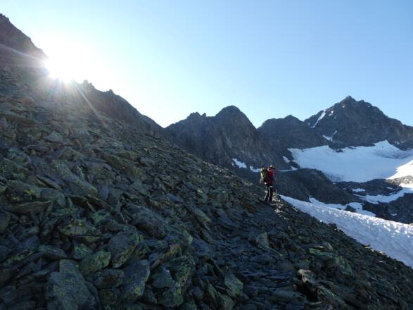 Vor allem an heißen Tagen die Gipfelbrotzeit besser auf nach dem Hüttekarferner legen, um die Passage unterhalb des Riffljochs noch in möglichst griffigem Zustand begehen zu können.