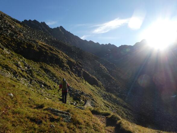 Am linken Rand des Kars im Sinne des Aufstiegs führt der gut markierte Weg über Felsplatten vorbei an den Abzweigungen zu Bruchkopf und Rotschragenjoch in einem leichten Rechtsbogen schließlich über gröberes Blockwerk zum Gletschervorfeld des Hüttekarferners - bereits hier ist mit Steinschlag zu rechnen.