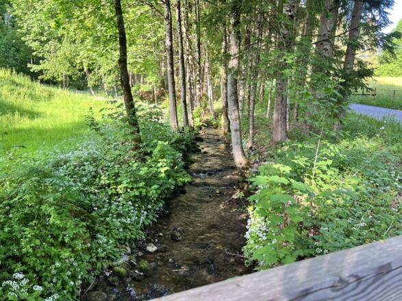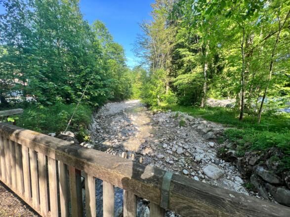 Weiter in Richtung Mühlbach geht es vorbei an einigen Wanderparkplätzen und zu unserem nächsten Stopp dem Hofladen "Isarwinkler Pumpheisl". Hier habt ihr die Möglichkeit frische, regional produzierte Leckereien für eure Brotzeit zu kaufen, wie z.B. Käse, verschiedene Aufstriche und auch leckere Schorlen. Entlang des Mühlbachs könnt ihr dann die wunderschöne Landschaft genießen. Am Ende der Mühlgasse müsst ihr die Sylvensteinstraße überqueren, da es hier leider keinen offiziellen Überweg gibt, seid hier bitte aufmerksam und vorsichtig.