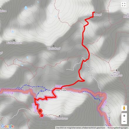 Mit der Doppelstockbahn geht es auf den Alp Trider Sattel. Dort startet die Wanderung. In rund einer Stunde gelangt man über die Alpstrasse via Alp Trida zur Alp Bella, wo bei der Hirtenfamilie eingekehrt werden kann. Von hier führt der Wanderweg über Alpwiesen weiter hinauf Richtung Grübelekopf. Dabei kommt man an der Felsformation „bei den Kirchen“ vorbei, hier kann man sprichwörtlich die „Alpenfaltung“ sehen; die gekrümmte Felsformation sieht aus wie ein riesiges Kirchenfenster. Die letzten 100 Höhenmeter erklimmt man über den steilen Weg bis zum Ziel. Der Gipfel liegt auf der Schweizerisch-Österreichischen Grenze und bietet schöne Ausblicke in die Umliegenden Alptäler und Berge. Der Abstieg führt auf demselben Weg wieder zurück zur Alp Trida, von wo aus die Sesselbahn zum Sattel benutzt werden kann.